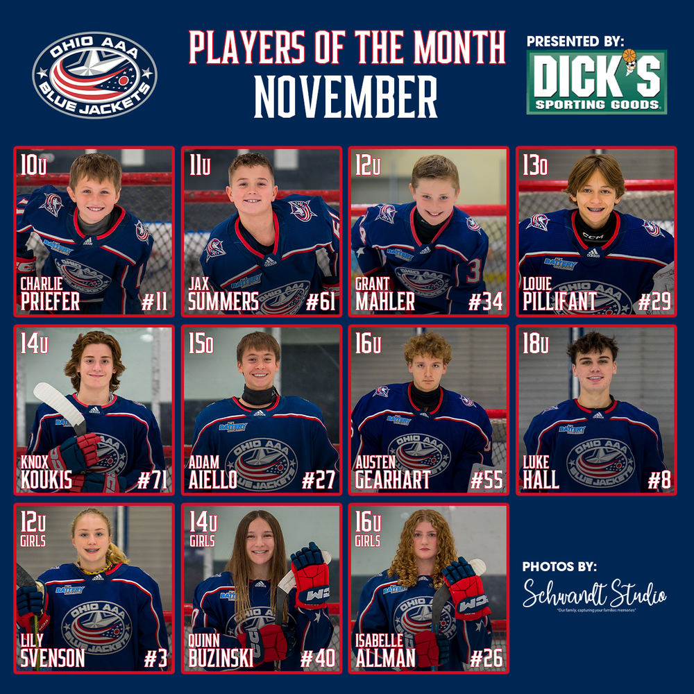 The Ohio AAA Blue Jackets are proud to announce the program's Players of the Month presented by DICK'S Sporting Goods. A new initiative this November, these awards are issued to one member from each team. Honored are student-athletes that excel on and off of the ice, demonstrate our holistic development model and represent the program's core values of process, respect, integrity, determination and excellence.